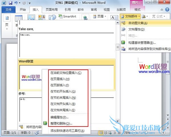 ①打开Word2010,插入我爱IT技术网LOGO,选中图片,单击插入--文档部件--自动图文集。点击下面的将所选内容保存到自动图文集。