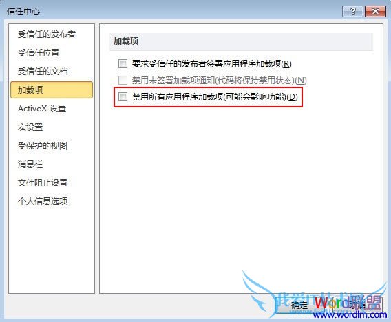 ⑤在加载项中勾选经验多有应用程序的加载项,确定即可解决故障。