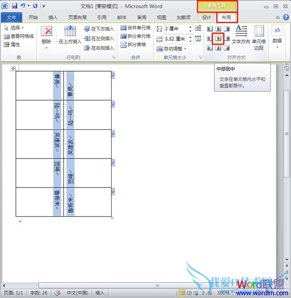 9.选中表格,单击“表格工具-布局”-“对齐方式”-“中部居中”按钮。