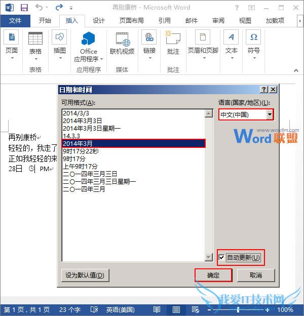 2、此时会弹出一个“日期和时间”的对话框,我们可以根据自己的需要选择“可用格式”和“语言”,以及是否“使用全角符号”和是否“自动更新”,然后单击“确定”按钮。例如,我们现在选择中文,格式中的第五种,并勾选“自动更新”复选框,单击“确定”按钮。