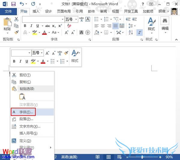 ②鼠标左键按住不放,选中文字,在右键菜单中选择字体。