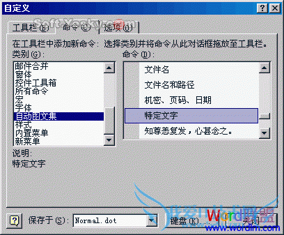 对于要经常输入的文字段,每次都一个字一个字的敲入,确实很麻烦!其实你可以把它制成一个按钮放在工具栏里,以后需要时,用鼠标一点即可。方法是:在“插入”/自动图文集/自动图文集中添加一项“特定文字”,然后打开“自定义”对话框,选取“命令”选项,在“类型”列表框中单击“自动图文集”,在右边命令框中找到刚才添加的“特定文字”项,将其拖放到工具栏即可。