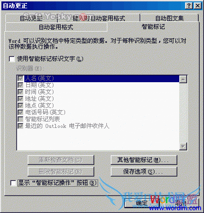 要关闭word XP能自动识别名字、日期、时间、地址、电话号码和最近使用过的电子邮件地址的智能标记,需要依次选择“工具”/自动更正选项,并点击“智能标记”标签,清除“用智能标记标识文本”和“显示智能标记操作按钮”二个检查框,并点击“确定”按钮。(还可以通过选择或清除“识别对象”清单中的检查框启动或禁止个别的智能标记功能。)