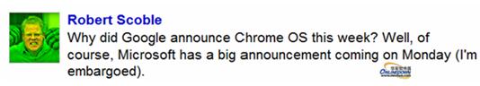 在博客中,Scoble指出:“为什么谷歌会在本周宣布退出Chrome操作系统?呃……当然是因为微软将会在下周一宣布重大决定了。但是,具体是什么决定,我暂时不方便透露。