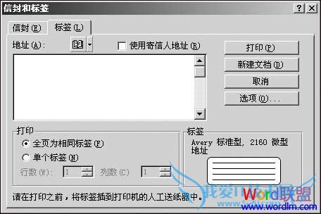新建一个文档,依次点击“文件→页面设置”菜单项,在弹出的对话框中设置“纸型”选项卡中的“纸型”项为“自定义大小”,其中的“宽度”为19.5cm;高度为29.7cm。接着依次点击“工具→信函与标签”菜单项,在弹出的对话框中点击“标签”选项卡中的“选项”按钮(如图2所示)。
