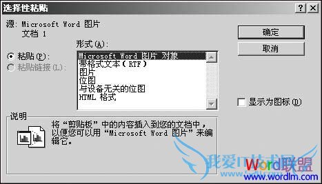 接着再返回制作单张名片时的word文档,依次点击“编辑→复制”、“编辑→全选”。此时单张名片的状态为全选状态。操作完后切换到有十个框的文档中,单击第一行第一列的那个单元格(即左上角),依次点击“编辑→选择性粘贴”菜单项,在弹出的“选择性粘贴”对话框中选择“Microsoft Word图片对象”项(如3所示)。