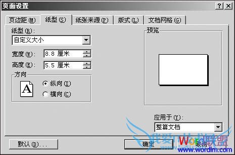 新建一个文档,单击菜单“插入→对象”,弹出“对象”对话框,选择“Microsoft word 图片”类型。接着单击“文件→页面设置”,在弹出的“页面设置”对话框中将“纸型”选项卡中的“纸型”项设为“自定义大小”,然后输入纸张大小为宽度“8.8cm”、高度“5.5cm”(5cm也可以)。在右侧“预览”部分可以看到单张名片的版式已经出来了(如图1所示)。