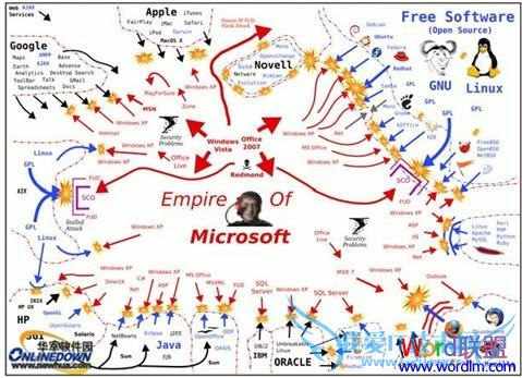 来自国外资讯网站Zdnet的的消息,微软作为世界软件巨头涉及了众多领域的各类产品。在微软的成长过程中,伴随着很多挑战和竞争,下面这幅图就形象的描绘了“微软帝国”的战略图。