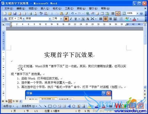 Word没有“首字下沉”这一功能。其实,我们只要对字符位置稍加设置,就可以实现“首字下沉”的效果。