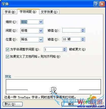 4、切换到“字符间距”标签下,单击“位置”右侧的下拉按钮,在随后出现的下拉列表中,选择“降低”选项,并在后面的“磅值”框中输入一个数字(根据需要调试,如“10磅”),确定返回。