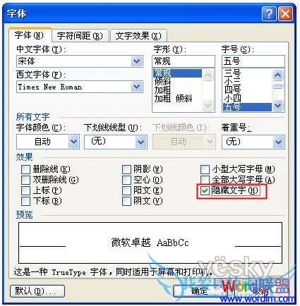 选中要隐藏的文字,然后,单击“格式→字体→效果”,将“隐藏文字”复选框勾选上,然后单击“确定”按钮。其他要隐藏的文字只要选中后按照上述方法执行即可(如图)。