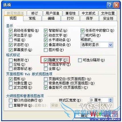 隐藏文字后,怎样设置能看得见它们呢?方法如下:单击“工具→选项→视图→格式标记”,选中“隐藏文字”复选框,这样我们就可以看到那些被隐藏的字符了。