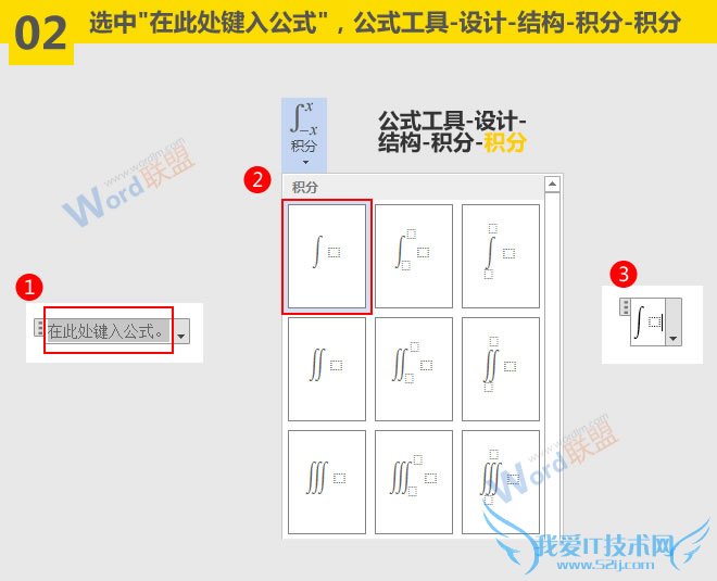 2、选中公式编辑框中的文字,进入“公式工具-设计”选项卡,在“结构”组中选择“积分”下的“积分”,公式编辑框中会出现如下图右侧的内容。