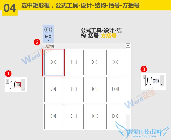 4、选中第二个积分符号右侧的矩形框,在“结构”组中找到“括号”,选择第一个方括号。