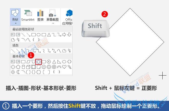 1、插入一个菱形,然后按住Shift键不放,拖动鼠标绘制一个正菱形。