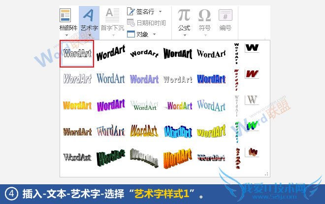 4、切换到“插入”选项卡,在“文本”组中单击“艺术字”下面的倒三角符号,选择一种艺术字样式,这里以“艺术字样式1”为例。