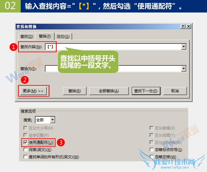 2、输入查找内容=“【*】”,然后勾选“使用通配符”,意思是查找用中括号括起来的一串文字。