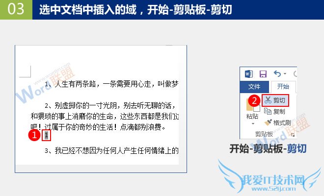 3、选中文档中插入的域,开始-剪贴板-剪切。现在,这个域就已经到我们的剪贴板之中了,大家可以打开剪贴板查看。需要注意的是,从现在起,到我们完成替换为止,大家最好不要再进行任何的复制或剪切操作了,因为这会使得我们剪贴板中置顶的内容发生变化,从而导致结果出错。