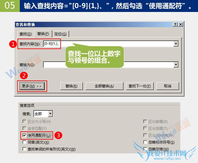 5、输入查找内容=“[0-9]{1,}、”,然后勾选“使用通配符”。