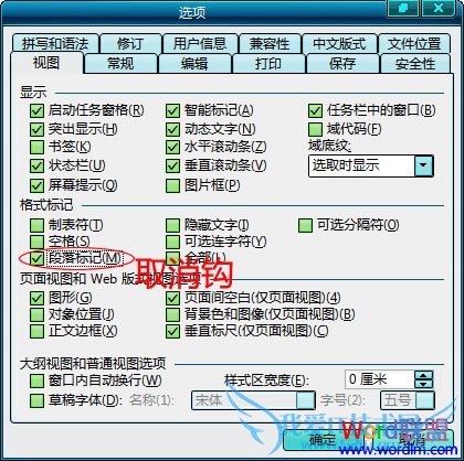 方法二、点击菜单栏的“工具”中的“选项”,进入“视图”窗口将“段落标记”前面的钩去掉,然后确定就OK了!