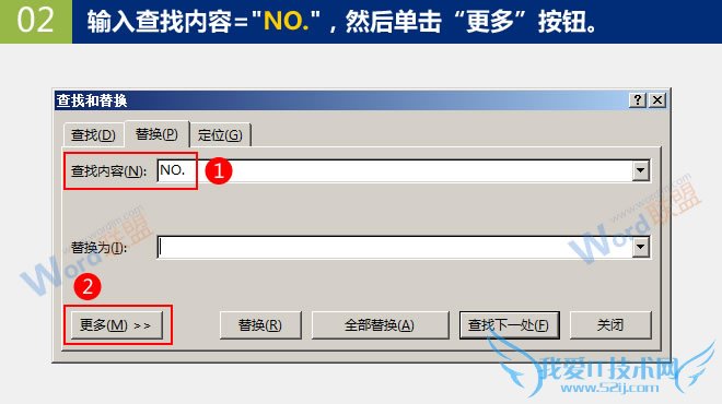 2、弹出“查找和替换”对话框,我们在“查找内容”右侧的文本框中输入“NO.”,然后单击对话框左下角的“更多”按钮。