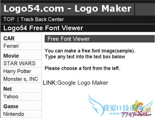 现在个人网站、博客在网络的海洋中如随风泛起的浪花一般,层层叠叠,数不胜数。想要在众人之中突显出来除了要有精彩的内容,还需要有一个醒目的Logo让人过目不忘。一些知名品牌以及网站的Logo可以称得上是其中的典范,于是我们常常模仿它们来设计自己的Logo。不过,对于不熟悉图形处理工具的人来说,这简直是不可能的任务,不过值得庆幸的是,我们还可以借助“Logo54.com”这个仿制Logo网站来帮我们解决上述难题。启动IE浏览器,在地址栏输入http://logo54.com/,登录Logo54.com。网站的页面风格十分简洁清晰(如图1),虽然是全英文的,但是我们还是能很快看出页面布局以及制作Logo的途径。页面的左侧列出了该网站所能制作的Logo样式,从上至下分为Car(汽车)类、Movie(影视)类、Net(网络)类和Game(游戏)类,虽然目前网站中所能制作的Logo种类不是很多,但个个都是经典之作。