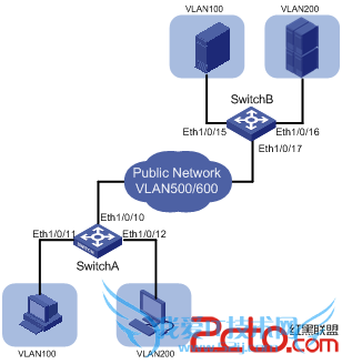 l 要求用户的VLAN100和VLAN200的报文在公网上传输时,分别使用VLAN500和VLAN600作为报文的VLAN标识。