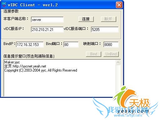 解释一下上面的设置: VIDC服务IP,指运行了vidcs.exe进行监听了端口的IP地址,端口指是在公网上监听的端口,上面我监听的是5205端口,bindip指你要开放出去的内网的IP, Bind端口指你内网计算机需要开放的端口(FTP服务器端口为21, WEB 服务端口为80, mail服务端口25)你想开放哪个就填哪个吧。