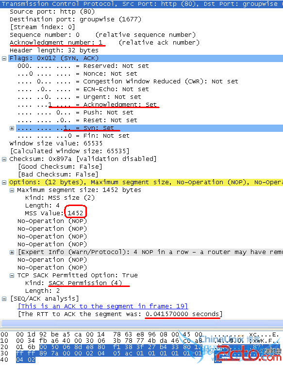 服务器响应客户端TCP报文段,此时确认号为1了,SYN=1、ACK=1表明连接应答捎