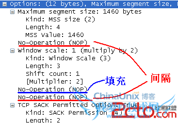 TCP的头部必须是4字节的倍数,而大多数选项不是4字节倍数,不足的用NOP填充。
