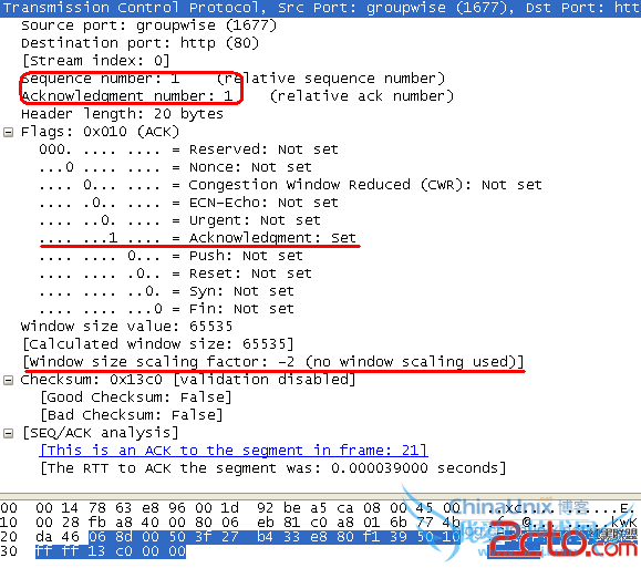 客户机再次服务器的报文段,此时序列号和确认号都为1,没有选项字段,Wireshark
