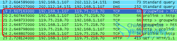 器间建立TCP连接,用Wireshark俘获的分组如下图: