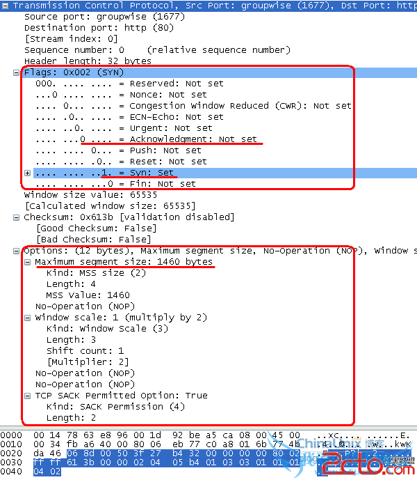 Wireshark俘获TCP连接第一次握手的报文段如下: