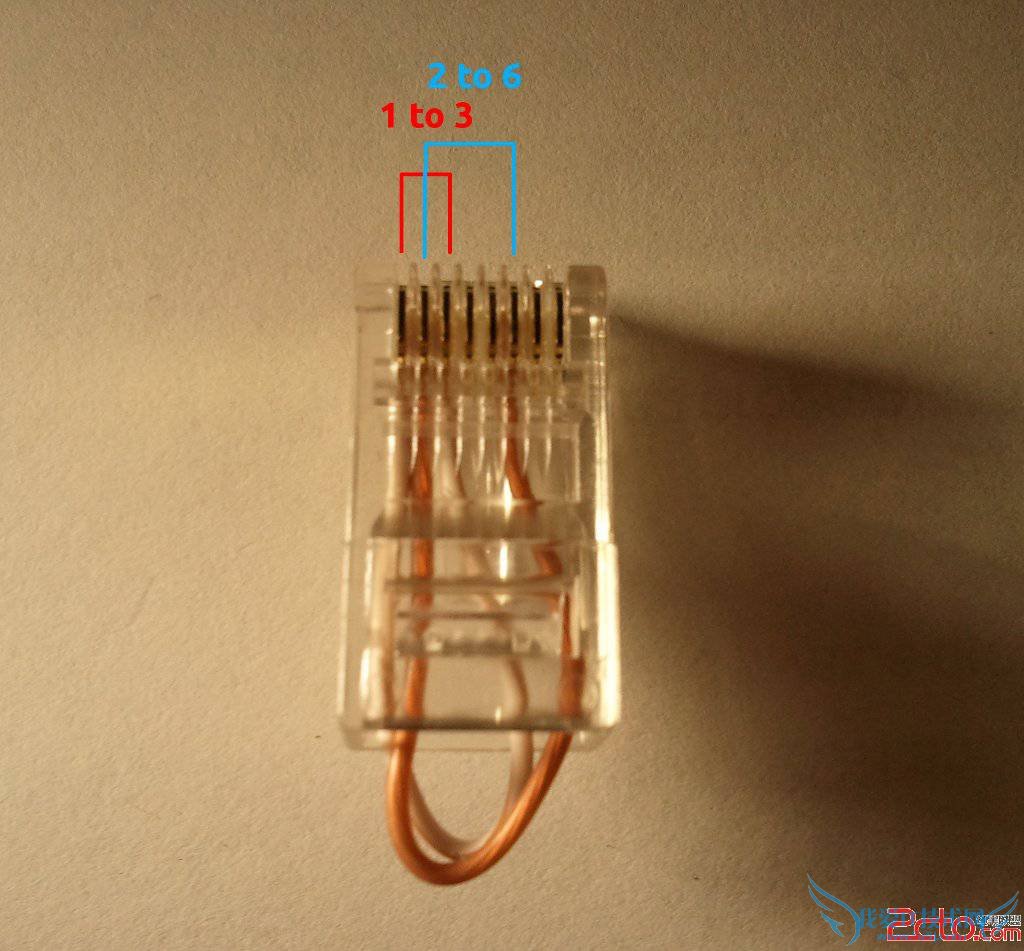 把发送针脚和对应的接收针脚直接短路就可以实现自首自发了。对于100MbRJ-45,把1-3, 2-6分别短路连接即可;对于千兆网RJ45,1-3,2-6,4-7,5-8对接即可。当然千兆的方式也适用于百兆,只是多浪费两根线。做成的水晶头如下: