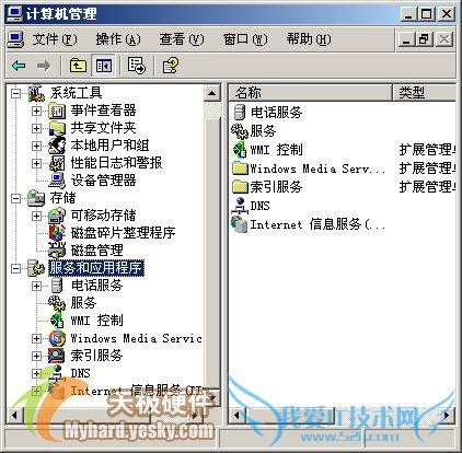 用鼠标右键单击系统桌面中的“我的电脑”图标,然后从弹出的右键菜单中执行“管理”命令,在打开的计算机管理窗口中,依次展开“服务和应用程序”/“Internet信息服务管理器”选项,如图4所示;