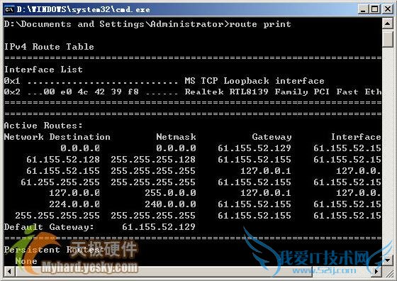 接着在DOS命令行中,执行“Route PRINT”命令,随后你将在如图3所示的界面中,看到本地工作站中的路由表信息。要是发现其中没有通往“默认网关”的路由信息时,你可以通过Route ADD命令来增加一条到默认网关的记录,以后工作站就能自动与默认网关连接了。