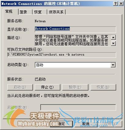 小提示:倘若在网络连接列表界面中,没有看到“本地连接”的图标时,你不妨依次单击“开始”/“运行”命令,在打开的系统运行对话框中,输入服务策略编辑命令“Services.msc”,单击“确定”按钮后,打开系统的服务列表窗口,双击其中的“Network Connections”项目,在随后出现的如图2所示的服务属性设置窗口中,检查“Network Connections”服务是否已经启动,要是没有的话,你可以单击“启动”按钮,然后从“启动类型”下拉列表中选中“自动”,最后单击“应用”、“确定”按钮,这样的话就能在网络连接列表窗口中,重新看到“本地连接”的图标了。