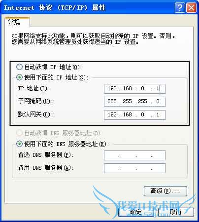 Step3:同样在“常规”选项卡中,我们选择“Internet协议(TCP/IP)”,在属性窗口中选择“使用下面的IP地址”,输入IP地址,比如192.168.0.1(图3),当然也可以设为192.168.0.2~192.168.0.255之间的任何一个地址;子网掩码一般为255.255.255.0;默认网关可以根据需要来设置;DNS服务器地址可以不设置。