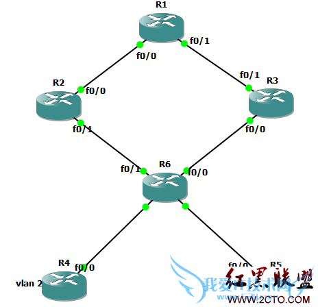 R6为交换机,R4属于vlan2,R5属于vlan3,R4,R5模拟成PC。