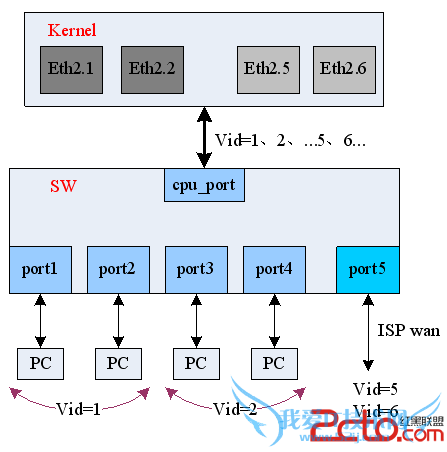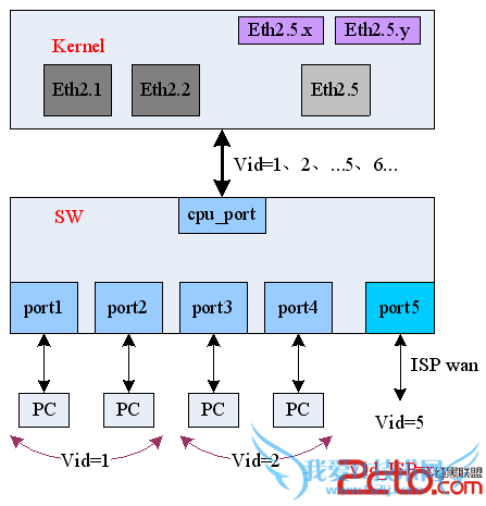 不同的是,它在Kernel采用两层vlan的方式。这就允许ISP发给SW的数据包可以自由带仍和vid的tag,SW硬件上会自动给数据包加上vid5(该port在SW内的vlan标示)的tag,然后交给Kernel,Kernel中的eth2.5首先剥掉vid5-tag,再根据二层vid交给相应的二层vlan设备来处理。