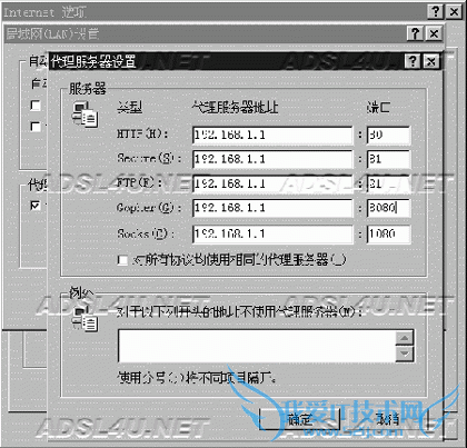 MSIE 工具->Internet选项->连接->局域网设置->代理服务器,选择使用代理服务器,输入浏览器相应应用协议的代理服务器地址和端口。这里除了HTTP以外的其他应用协议只对浏览器本身用到的该应用协议起作用,例如浏览器内置的FTP浏览功能。对于其他独立的应用软件还需要对其独立设置。