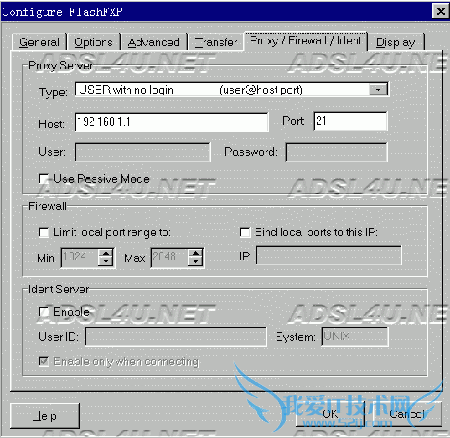 Flash_FXP: Options -> Preference- ,选择Proxy/ Firewall/Ident,并确定Use PASV Transfer Mode选项没有被选中,若你使用PASV Mode,则WinGate会回应给你错误讯息,Type注意要选择User with no logon,Host 输入192.168.1.1作为代理服务器,port值是21。 CuteFTP: 选[ftp]-[settings]-[option]-[firewall] host中填入192.168.1.1,Port:21,type选 USER user@site。打开 enable firewall。 其他 FTP软件设置与上两种基本相同。