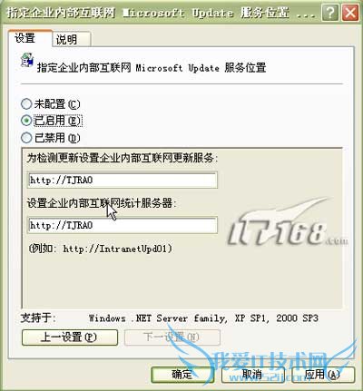 打开“指定企业内部互联网Windows Update服务位置”策略,选择“已启用”,接着在输入框中指定SUS服务器的位置,可以使用SUS Server机器名或IP地址,最后点击“确定”。