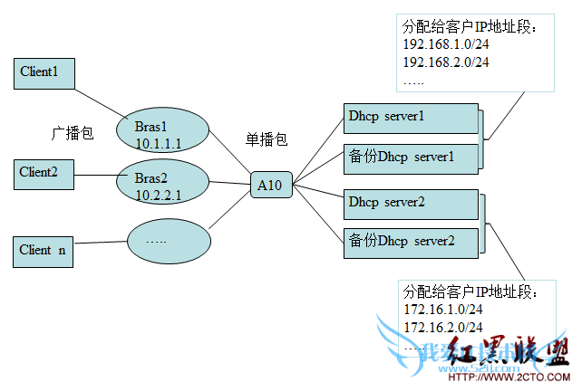 7. 同样道理,如果是Client2发出请求,则会通过Bras2来转发,根据规划,要由DHCP Server2来处理,重复以上的处理流程即可。