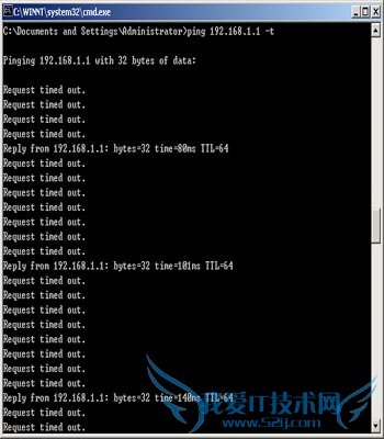 2.出现网络中断后,此时在PC机上ping ADSL Modem网关(192.168.1.1),表现为大量丢包或完全不通。如下图所示: