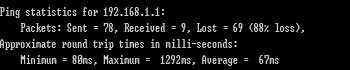 数据的丢包率在88%左右,返回值的最大时延达到1292ms,可用性很差。