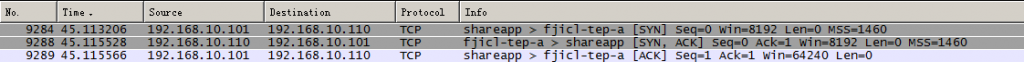 现在来看一下通过抓取工具观察到的三次握手协议,如下图1所示