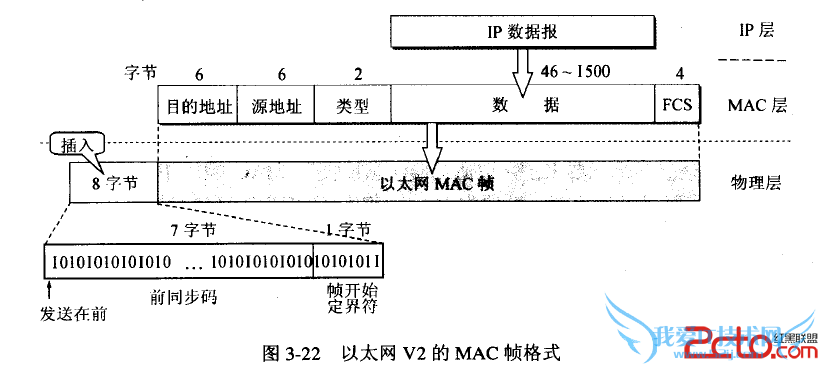 ¿ÉÒÔ¿´³ö£¬MACÖ¡µÄÊײ¿ÓÐ14×Ö½Ú£¬Î²²¿ÓÐ4×Ö½Ú¡£Êý¾Ý²¿·Ö³¤¶ÈΪ46~1500×Ö½Ú¡£Î²²¿ÊÇʹÓÃCRC¼ìÑéµÄÖ¡¼ìÑéÐòÁÐFCS¡£ÔÚ½»¸¶¸øÎïÀí²ãʱ£¬ÔÚ֡ǰ»¹Òª¼ÓÉÏ8×Ö½ÚµÄͬ²½ÂëÓÃÓÚͬ²½Ê±ÖÓÆµÂÊ¡£