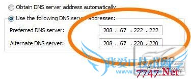 选择屏幕底部的“使用下面的DNS服务器地址”。对于首选DNS服务器,输入这个地址: 208.67.222.222。对于备用DNS服务器,输入这个地址: 208.67.220.220。点击“确定”,如下图。