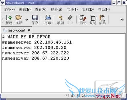 如果使用的是Linux工作站那么修改方法会不相同,在RHEL 4或者5 中,首先修改网络配置文件:/etc/resolv.conf文件添加两行,如图8
